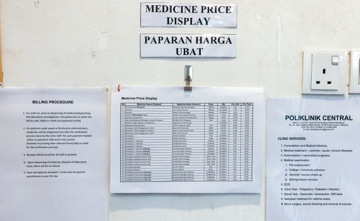 The price display order under the Price Control and Anti-Profiteering Act 2011 (Act 723), which is in KPDN’s jurisdiction, requires community pharmacies and private health care facilities, including GP clinics, specialist clinics, dental clinics, and hospitals, to display retail medicine prices.